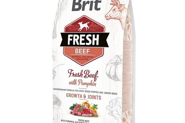 Brit Fresh Beef with Pumpkin Puppy Large Bones & Joints, 2.5 kg este o hrana fresh completă cu carne de vită proaspătă, dovleac, hrișcă și rozmarin. Pentru oase și articulații sănătoase. Formula superpremium pentru puii de rasa mare si câinii juniori.