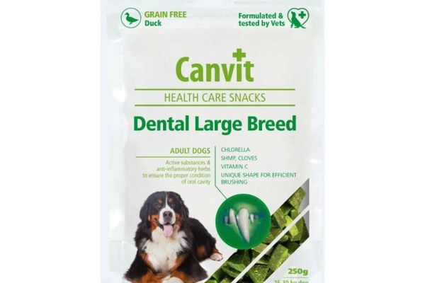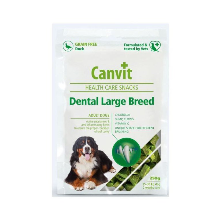 Canvit Health Care Dental Snack Large Breed, 250 g este o gustare funcţională semi-umeda pentru câini adulţi şi seniori de talie mare, pentru igiena dentară de zi cu zi.\nIngrediente: cartofi, pui (15%), amidon lichid, ulei de hering (5%), ficat de pui hidrolizat, colagen, Chlorella (5 g/kg), hexametafosfat de sodiu (2g/kg), cuişoare (1g/kg)\nConstituenți analitici: proteine 16%, conţinut în grăsimi 7,5%, umiditate 17%, cenuşă brută 3,5%, fibră brută 1,5%.\nSubstanțe suplimentare nutritive per 1 kg: vitamina C 600 mg.