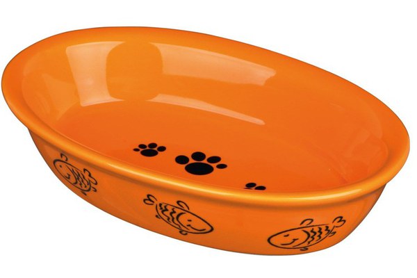 Castron din ceramica cu model de peste si labute. Castron pentru apa sau hrana, potrivit pentru pisici.\nCastronul se poate spala in masina de spalat vase.\nDimensiuni: 15 × 10 cm\nCapacitate: 0,2 l\nDiverse culori. Selectarea culorilor nu este posibila. Depinde de disponibilitatea stocului.