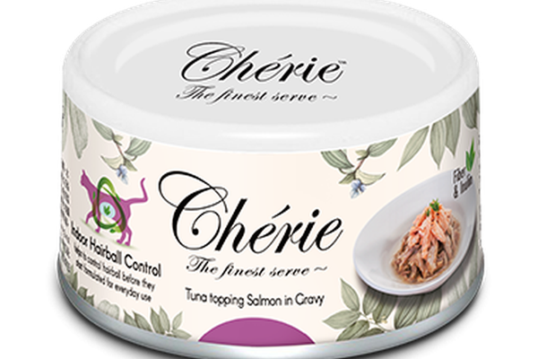 Fulgi de ton natural selectionati cu sos delicios ce ofera pisicii tale o sarbatoare delicioasa si sanatoasa.\nAdauga in mod special o formula pentru controlul ghemelor de par pentru a ajuta la reducerea formarii ghemelor de par, la reducerea mirosului si la mentinerea digestiei sanatoase.\nChérie – Hairball Control Series va permite sa va rasfatati pisica cu gustul mancarii savuroase in timp ce controlati ghemele de par. Hrana naturala pentru pisici Toate ingredientele naturale, alimente adevarate capturate din ocean. Fara substante chimice, produse secundare si umpluturi. Fara cereale Fara cereale, grau, porumb, soia sau gluten. Fibre naturale Amestecuri de fibre naturale pentru a ajuta la minimizarea ghemelor de par. Cu inulina si Fructo oligozaharide pentru a ajuta digestia. Gatit la abur O modalitate cea mai buna si sanatoasa de a gati fructele de mare pentru a-si prezerva elementele nutritive naturale. Nutritie pentru pisici Cu cele mai importante elemente de nutritie pentru pisici – Taurina.