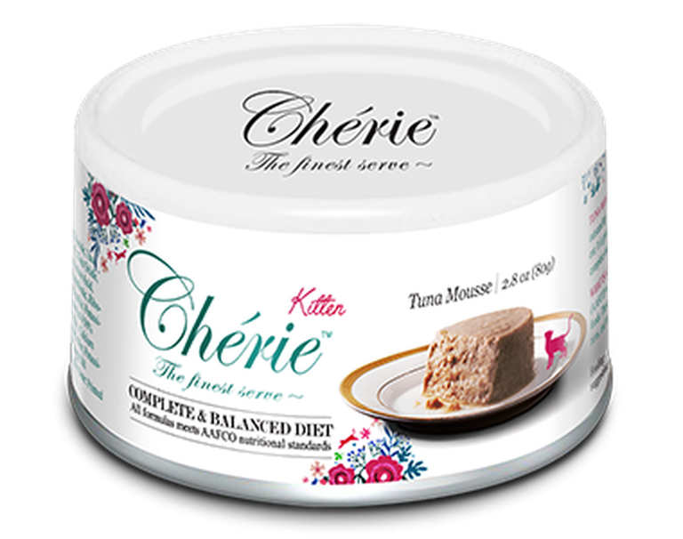 Formula Tuna Mousse Pentru Puii de Pisica combina ingrediente de inalta calitate pentru o nutritie exceptionala si proteine de inalta calitate, tonul de apa sarata ca prim ingredient.\n\nNu contine cereale, nu contine coloranti artificiali, arome sau conservanti. Aceasta dieta completa si echilibrata din punct de vedere nutritional ofera pisicilor dumneavoastra tot ce au nevoie pentru a se dezvolta.\nNutritie 100% completa si echilibrata. Chérie Dieta Completa & Echilibrata - Kitten este formulata pentru a indeplini nivelurile nutritionale stabilite de AAFCO (Association of American Feed Control Officials) Profilurile de nutrienti pentru hrana pentru pisici pentru crestere, gestatie si lactatie.\n\n Fara cereale si gluten Fara cereale, grau, porumb, soia sau gluten. 100% ton de apa sarata Ton salbatic de apa sarata prins natural ca prim ingredient. Dolphine Safe Nu s-au ranit delfini in timpul procesului de pescuit a tonului in ocean. Gatit la aburi Prepararea la abur este una dintre cele mai bune si mai sanatoase metode de gatit pentru a pastra valorile nutritionale naturale. Taurina adaugata Taurina – un aminoacid esential necesar tuturor pisicilor, a fost adaugata la toate Chérie Complete & Balanced. 2 ORE DE CONTROL AL PROSPETIMII Materiile prime folosite pentru fiecare conserva sunt curatate, ambalate si finisate in 2 ore pentru a mentine prospetimea alimentelor. Acesta este unul dintre motivele cheie pentru care Chérie este o mancare atat de gustoasa indragita de pisici.