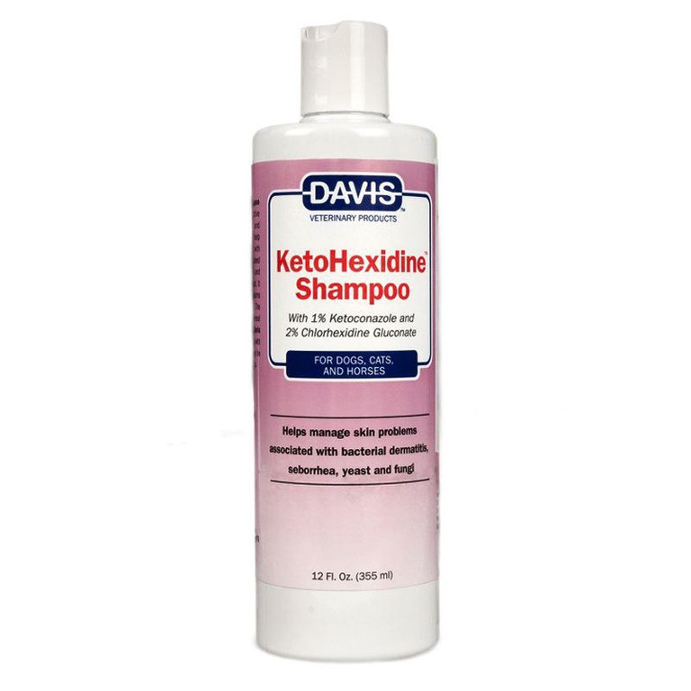 Davis Sampon Ketohexidine, 355 ml - Sampon terapeutic pentru caini, pisici si cai, antiseptic cu rol complementar in tratamentul dermatitelor microbiene si fungice.\n\nCombinatia a doua ingrediente eficiente (1% ketoconazol si 2% gluconat de clorhexidina) fac din samponul Davis KetoHexidine un remediu complementar in gestionarea starilor seboreice si a dermatitelor asociate cu bacterii si fungi.\nFulgii de ovaz si Aloe Vera atenueaza pruritul si hidrateaza pielea. Parfumul discret diminueaza mirosul neplacut tipic starilor kerato seboreice. Poate fi utilizat la caini, pisici si cai.\n\nMod de utilizare: \n\nSe umezeste bine blana. Se aplica produsul si se maseaza energic pentru a se obtine o spuma usoara. Se va evita contactul cu ochii.\nSe lasa sa actioneze timp de 5-10 minute, dupa care se clateste cu apa din abundenta.\nInitial se recomanda 2-3 samponari pe saptamana timp de 1 luna, ulterior frecventa spalarilor se reduce la 1/saptamana sau conform recomandarilor medicului veterinar.\n\nCompozitie: Clorhexidina gluconat, ketoconazol, fulgi de ovaz, Aloe Vera, Ammonium Laureth Sulfate, Cocamidopropyl Betaine, Agent de perlare, Apa purificata, Ulei de menta, Conservant si colorant de uz cosmetic.Atentionari: Utilizarea acestui produs nu exclude tratamentul pe cale generala. Solicitati sfatul medicului veterinar. Spalati mainile dupa utilizare. Daca apar iritatii, intrerupeti administrarea si consultati medicul veterinar.