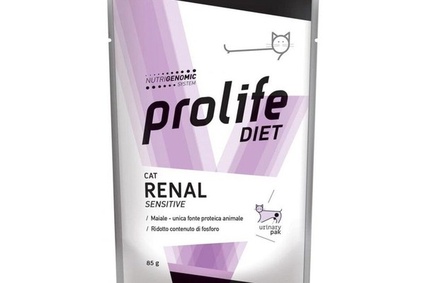 Dieta veterinara pisici, Prolife Vet Renal Sensitive, 85 g este o hrană dietetică completă pentru pisici formulată pentru a susține funcția renală în caz de insuficiență renală cronică sau temporară. \n\nNivelul scăzut de fosfor ajută la încetinirea progresiei insuficienței renale, în timp ce carnea proaspătă de porc, este ideală în caz de sensibilitate.