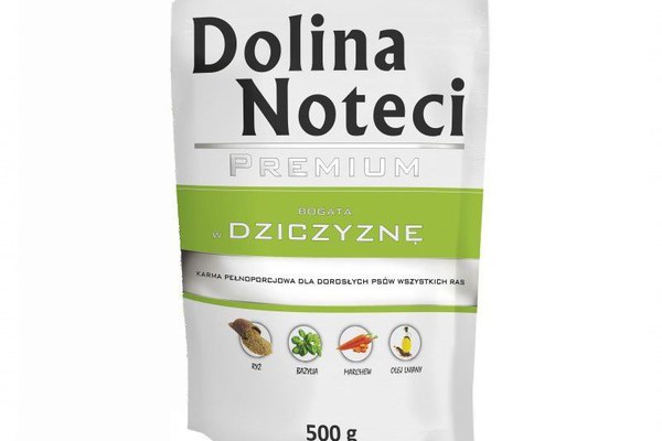 Hrana umeda pentru caini Dolina Noteci Premium cu vanat 500 g este o alimentatie naturala destinata tuturor raselor de caini adulti.\nHrana umeda pentru caini Dolina Noteci Premium cu vanat 500 g nu contine cereale cu potential alergogen: grau, porumb, orz, ovaz.\nCaracteristici si beneficii:\n\nCarnea de vanat este o carne superioara tuturor celorlalte carnuri datorita continutului ridicat in proteine si redus in grasimi. Carnea de vanat provine de la animale crescute natural fiind indicata si animalelor ce manifesta sensibilitate la componentele hranei;\nHrana umeda ofera varietate meniului caruia ii furnizeaza un plus de nutrienti;\nDigestie sanatoasa. Fibre (orez brun , morcov )ce promoveaza sanatatea bacteriilor benefice intestinale, regleaza tranzitul, imbunatatesc digestia si mentin imunitatea la nivel intestinal.