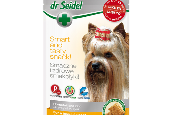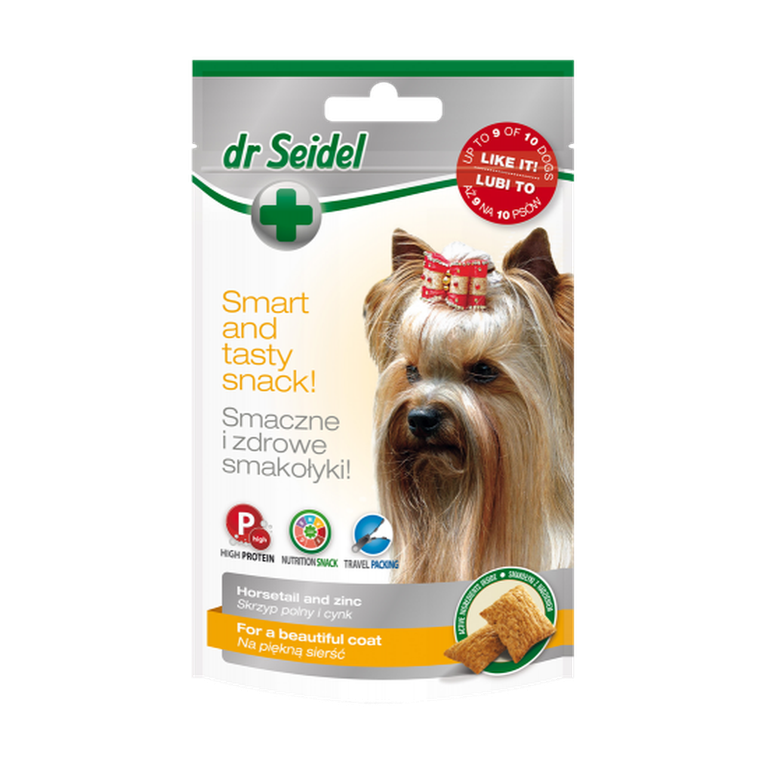 Gustările Dr. Seidel pentru o blană frumoasă sunt gustări pentru câini de valoare completă, îmbogățite cu coada-calului și zinc.\nCoada-calului imbunatateste aspectul blanii si previne bolile de piele. Zincul sporește imunitatea pielii și accelerează vindecarea rănilor.\nRecomandări: gustări pentru menținerea pielii și părului frumos al animalului. Recomandat în special în timpul năpârlirii, când probleme cu părul și pielea, și înainte de expoziții. Perfect ca gustări între mese sau recompense de antrenament (ca antrenori).\nSubstanțe active:\n\ncoada-calului\n zinc\n\nContradicții/ Atenție: nu este necesară suplimentarea cu coada-calului și zinc atunci când utilizați gustări Dr. Seidel.