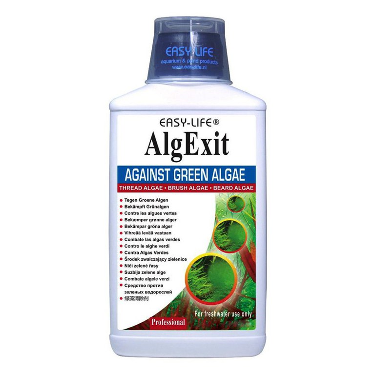 Easy Life Algexit 250 ml - Solutie pentru algele ce se formeaza in acvarii, combate algele verzi din acvarii, cum ar fi beard algae, brush algae si thread algae.Este inofensiv pentru pesti, nevertebrate si plante.Mod de folosire:\n\nA se scutura bine inainte de folosire. Se vor adauga 10 ml la fiecare 100 litri de apa o data pe saptamana, timp de patru saptamani.\nAceasta perioada poate fi extinsa daca algele persista sau sporii continua sa germineze.\nPentru uz preventiv se vor adauga 5 ml la fiecare 100 litri odata la doua saptamani.\n\nPrecautii:\n\nIn timpul folosirii se va inlatura filtrarea cu carbon activ.\nSe vor utiliza cu precautie orice produse cu efect biocid.\nNu se va supradoza.\nA nu se lasa la indemana copiilor.\nSe va folosi doar in acvarii de apa dulce.