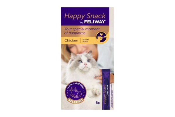 Feliway Happy Snack cu Pui, 6 buc x 15 g este o gustare cremoasa relaxanta: hrana complementara (se poate administra de la varsta de 12 saptamani)\n\nGustare lichida cu aroma de pui.\nCu alfa-cazozepina: o proteina naturala din lapte cu proprietati cunoscute de calmare. Ajuta pisicile sa fie mai linistite.\nContinut scazut de calorii. Fara conservanti. Fara zahar adaugat. Fara coloranti artificiali. Fara gluten.