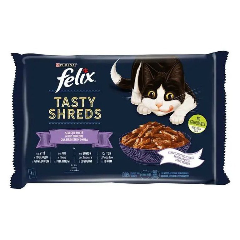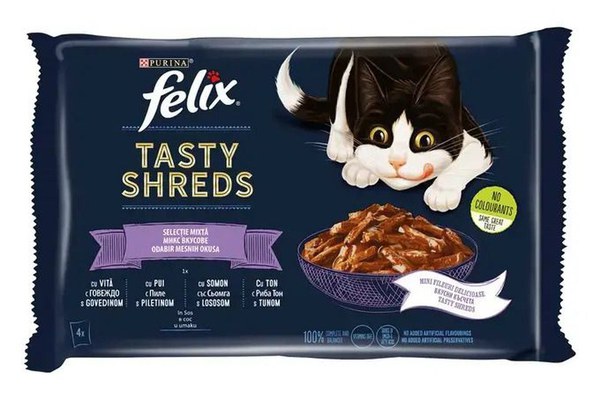 Felix Tasty Shreds este o hrană umedă echilibrată, completă pentru pisici adulte, care furnizează acestora ingrediente valoroase, printre care acizi grași Omega-6 și vitaminele D și E.\nHrana include fâșii delicate de carne în sos delicios.\nAcesta este ambalată în pliculețe practice, astfel că prospețimea este asigurată la fiecare masă.\nNu conține coloranți, arome și conservanți artificiali.