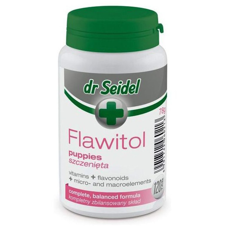 Flawitol Puppy 120 tablete - pentru utilizarea de zi cu zi la pui de caini din rasele mici şi mijlocii şi căţelele gestante şi în lactaţie.\n\nProtejează împotriva radicalilor liberi, adaptat în mod specific la nevoile crescute ale organismului în creştere.\nFolosirea regulata a preparatului asigură dezvoltarea adecvată a tuturor organelor,\n\nCOMPOZITIE: Calciu, Fosfor, Magneziu, Cupru, Iodina, Fier, Seleniu, Zinc, Mangan, Vit A, Vit D3, Vit E , Vit B1,Vit B2, Vit.B6, Vit B12, Vit B5, Biotina, Acid folic,(Vit B4), Flavonoizi, DrojdieMOD DE ADMINISTRARE:\n\n1 tab/ 3 kg gv/ zi\nSe administreaza pe cale orala impreuna cu hrana.\nIn perioada de crestere pana la varsta de 7-8 luni.