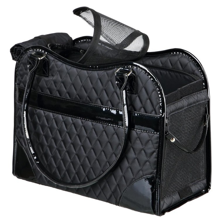 Geanta de transport din poliester (matlasata) captusita cu piele artificiala.\nPoate fi deschisa in fata si in partea de sus. Cu 2 buzunare laterale. Lesa scurta impiedica animalul de companie sa sara din geanta. Cu insertii nete pentru o circulatie buna a aerului.\n\nDimensiuni: 37 × 18 × 29 cm\nLungime:37 cm, Latime: 18 cm, Inaltime: 29 cm\nCuloare: negru