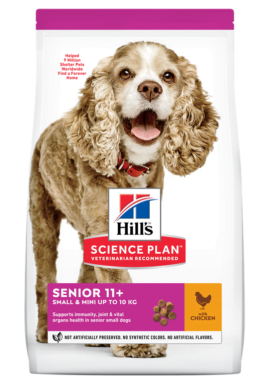 Dragoste mare, talie mică. Hrana pentru câini HILL'S SCIENCE PLAN SMALL & MINI Senior 11+ cu pui este o hrană adaptată pentru a sprijini îmbătrânirea sănătoasă a câinilor de talie mică și pitică. Concepută special cu crochete de dimensiuni foarte mici, conţine fibre prebiotice pentru digestie sănătoasă.\n\nOmega-3 din ulei de peşte pentru articulaţii sănătoase şi mobilitate\nCantitate echilibrată de minerale pentru inimă, rinichi şi vezică\nAmestec de Omega-6 şi vitamina E pentru o piele sănătoasă şi o blană bogată\nConţine amestecul nostru special de antioxidanţi Small & Mini pentru a susține imunitatea de-a lungul vieţii\n\nRecomandat pentru:\nCâini adulţi 11+ ani care cântăresc până la 10kg la maturitate.\n \nNu este recomandat pentru:\nCăţei, căţele gestante, lactante, câini adulţi sau maturi. În timpul perioadei de gestaţie sau lactație, căţelele trebuie să consume hrana HILL'S SCIENCE PLAN Puppy.\n \nInformații suplimentare:\nNutriţie cu un gust excelent pentru o viaţă lungă şi fericită. Pentru că fiecare moment pe care îl petreceți împreună este special, ne străduim să vă oferim cât mai multe. Cu ingrediente sănătoase şi substanţe nutritive potrivite, HILL'S SCIENCE PLAN este pregătit pentru a-i oferi câinelui tău nutriţia de care are nevoie pentru sănătate şi fericire pe tot parcursul vieţii.\nPregătim hrana pentru animale cu ingrediente de cea mai bună calitate. Aceste ingrediente trebuie să respecte cerinţele noastre stricte privind puritatea şi conţinutul de nutrienţi, care depăşesc standardele din industrie.\nGHID DE HRĂNIRE\nSFATURI UTILE\n\nAjustaţi cantitatea de hrană necesară pentru a menţine greutatea optimă. Dacă nu sunteţi sigur, adresaţi-vă medicului veterinar.\nUtilizaţi pentru prima dată acest tip de hrană? Amestecaţi cantităţi în creştere din hrana nouă cu cantităţi în scădere din hrana veche timp de 7 zile.\nAsiguraţi-vă că apa proaspătă este întotdeauna disponibilă!\nNevoile nutriționale ale animalelor de companie se pot schimba odată cu vârsta. Cereţi sfatul medicului veterinar la fiecare control.\nPentru a preveni sufocarea, nu lăsaţi ambalajul la îndemâna animalelor şi copiilor.\n\nGhid de hrănire\n\n\n\n\nGreutate corporală (kg)\n\n\nGrame hrană uscată\n\n\n\n\n1.5\n\n\n35\n\n\n\n\n2\n\n\n45\n\n\n\n\n3\n\n\n60\n\n\n\n\n4\n\n\n75\n\n\n\n\n5\n\n\n90\n\n\n\n\n7.5\n\n\n120\n\n\n\n\n10\n\n\n150\n\n\n\n\n \nINGREDIENTE\nCOMPOZIŢIE: făină din carne de pui şi curcan, porumb, grâu, brizură de orez, orez brun, hidrolizat, orz, ovăz, grãsimi de origine animală, ulei vegetal, ulei de peşte, substanţe minerale, pulpã de sfeclã deshidratatã, seminţe de in, borhot de tomate, pulpă de citrice deshidratată, pudră de spanac.\n \n \nMEDIA CONȚINUTULUI CALORIC ȘI NUTRIȚIONAL\n3710 kcal/kg (371 kcal/100g)\n\n\n\n\nNutrient\n\n\nSubstanță uscată %\n\n\n\n\nProteine\n\n\n21.4\n\n\n\n\nGrăsimi\n\n\n15.5\n\n\n\n\nFibre\n\n\n1.8\n\n\n\n\nCarbohidrați (extract liber de nitrogen)\n\n\n56.0\n\n\n\n\nCalciu\n\n\n0.86\n\n\n\n\nFosfor\n\n\n0.65\n\n\n\n\nSodiu\n\n\n0.27\n\n\n\n\nPotasiu\n\n\n0.75\n\n\n\n\nMagneziu\n\n\n0.097\n\n\n\n\nL-carnitină\n\n\n364.7 ppm\n\n\n\n\nVitamina C\n\n\n127 ppm\n\n\n\n\nVitamina E\n\n\n447 IU/kg\n\n\n\n\nAcizi grași omega-3\n\n\n1.19\n\n\n\n\nAcizi grași omega-6\n\n\n3.31\n\n\n\n\nCenușă\n\n\n5.3\n\n\n\n\nBeta caroten\n\n\n2.61 ppm\n\n\n\n\nVitamina A\n\n\n11828 IU/kg\n\n\n\n\nVitamina D\n\n\n820 IU/kg