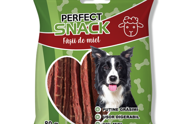 Perfect Snack este o hrană complementară extrem de gustoasă pentru câinele tău! \n\nPuține grăsimi\nUșor digerabil\n92% miel \n\nIngrediente: Miel 82%, plămâni de miel 10%, amidon din cartofi dulci 4,5%, glicerină 1,65%, sorbitol 1,5%, sare 0,25%, sorbat de potasiu 0,1%.\nAnaliză: Proteine brute 45%, grăsimi brute 4,8%, fibre brute 1,2%, minerale 3,5%, umiditate 18%.\nRecomandare de hrănire:\nSnack care vine să completeze mesele principale. Ajustați porția de hrană în mod adecvat. Hrană complementară. Recomandăm supervizarea pe durata hrănirii. Oferiți întotdeauna apă proaspătă câinelui dvs.. Poate conține urme de alte ingrediente. A se păstra într-un loc uscat și răcoros.