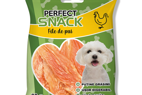 Perfect Snack este o hrană complementară extrem de gustoasă pentru câinele tău! \n\nPuține grăsimi\nUșor digerabil\nFără zahăr\n98% carne \n\nIngrediente: Piept de pui 98%, amidon din cartofi 2%.\nAnaliză: Proteine brute 65%, grăsimi brute 3,2%, fibre brute 1,2%, minerale 3,2%, umiditate 15%.\nRecomandare de hrănire:\nSnack care vine să completeze mesele principale. Ajustați porția de hrană în mod adecvat. Hrană complementară. Recomandăm supervizarea pe durata hrănirii. Oferiți întotdeauna apă proaspătă câinelui dvs.. Poate conține urme de alte ingrediente. A se păstra într-un loc uscat și răcoros.