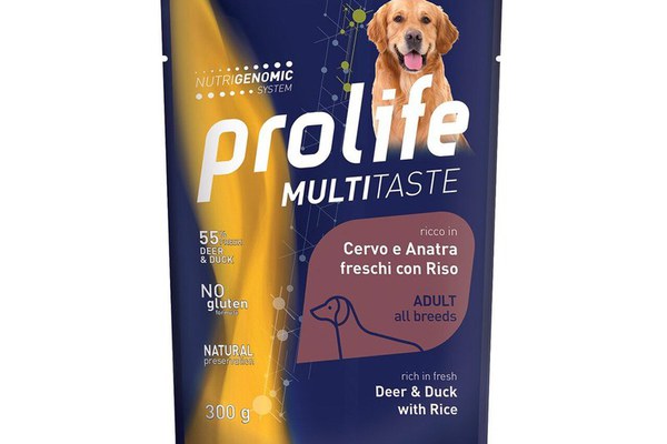 Hrana umeda caini, Prolife Cerb, Rata & Orez, 300 g - pentru câini adulți din toate rasele, bogată în carne proaspătă de cerb și rață cu orez. \nFără conservanți sau coloranți adăugați. Nutrigenomica studiază modul în care nutriția și, prin urmare, alimentele pot influența expresia genelor, pentru a ajuta o varietate de funcții fiziologice fundamentale. Combinând genetica cu nutriția, scopul este de a înțelege efectele interacțiunii dintre alimente, nutrienți și genom, moștenirea genetică completă a fiecărui organism viu. Această interacțiune are efecte definitive asupra metabolismului și vă permite să adoptați un program nutrițional foarte personalizat pentru a spori bunăstarea câinelui. Prolife susține această filozofie care spune că nu există o alimentație mai bună decât cea concepută cu atenție pentru a satisface nevoile specifice ale unui corp. Utilizând această știință, Prolife a dezvoltat rețete adaptate diferitelor vârste și nevoi nutriționale ale câinelui dumneavoastră.