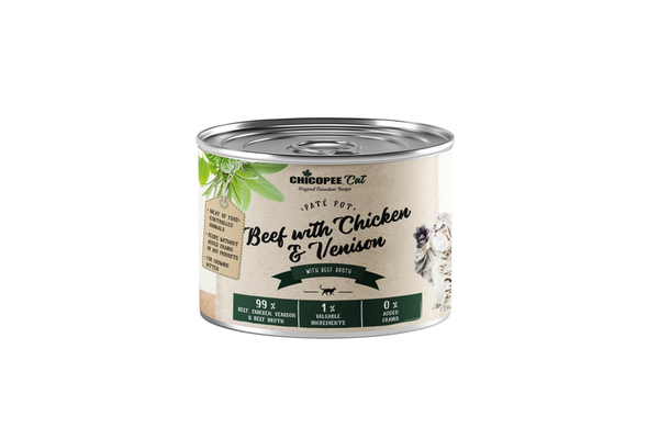 Hrana umeda pisici, Chicopee Beef with Chicken & Venison, Kitten, 195 g - oferă animalului dumneavoastră de companie toate vitaminele și mineralele necesare. \n\nHrană completă bine echilibrată pentru creșterea puilor de pisică până la 12 luni\nRețetă fără cereale (proteine 11% / grăsimi 5,5%)\n99% carne de vită, pui și căprioară\n\n\nEchilibrează dieta pisicuțelor, ajutându-le să fie mereu sănătoase și bine îngrijite.\nConservele Chicopee reprezintă o hrană umedă completă pentru pisoi, produsă în Germania din carne și legume de calitate superioară.\nRețetă cu 99% carne (carne, organe și supă de carne).\nConservele Chicopee sunt fabricate din legume proaspete ce oferă bunăstare și vitalitate animalului dumneavoastră de companie.\nProdusul nu conține soia sau gluten!