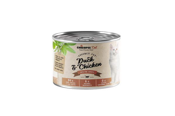Hrana umeda pisici, Chicopee Duck & Chicken, Adult, 195 g - oferă animalului dumneavoastră de companie toate vitaminele și mineralele necesare. \n\nHrană completă bine echilibrată pentru pisici adulte\nRețetă fără cereale (proteine 9% / grăsimi 6%)\n94% carne de rață, pui și supă de rață\n\n\nEchilibrează dieta pisicuțelor, ajutându-le să fie mereu sănătoase și bine îngrijite.\nConservele Chicopee reprezintă o hrană umedă completă cu rață și pui dedicată pisicilor adulte, produsă în Germania din carne și legume de calitate superioară.\nRețetă cu 94% carne (carne de rață, pui și supă de rață).\nConservele Chicopee sunt fabricate din legume proaspete ce oferă bunăstare și vitalitate animalului dumneavoastră de companie.\nProdus 100% natural, fără conservanți, coloranți și aromatizanți. \nRețetă dedicată animăluțelor cu alimentație controlată, fără adaos de gluten și soia.