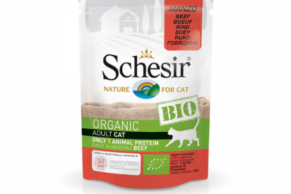 Hrana umeda pentru pisici Schesir Bio este o hrana completa pentru pisici adulte.\nCARACTERISTICI SI BENEFICII:\n\nControlata si certificata ca organica;\nNu contine cereale, FARA GLUTEN;\nNu contine coloranti si conservanti;\nHrana echilibrata;\nReteta cu o singura sursa de proteine animale;\nReteta cu proteine animale ca ingredient principal;\nGrad de digestibilitate foarte ridicat.