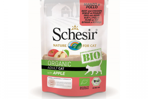 Hrana umeda pentru pisici Schesir Bio este o hrana completa pentru pisici adulte.\nCARACTERISTICI SI BENEFICII:\n\nControlata si certificata ca organica;\nNu contine cereale, FARA GLUTEN;\nNu contine coloranti si conservanti;\nHrana echilibrata;\nReteta cu o singura sursa de proteine animale;\nReteta cu proteine animale ca ingredient principal;\nGrad de digestibilitate foarte ridicat.