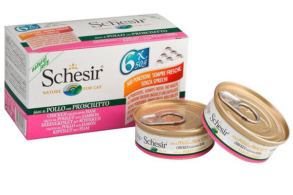 Hrana umeda pentru pisici adulte\nCompozitie: file de pui 63%, sunca 4%, agent gelifiant vegetal.\nConstituenti analitici: umiditate 85%, proteina bruta 13%, continut de grasime 1%, fibra bruta 0,1%, materie anorganica 1%. Vitamine/kg: vit. A 1325 UI, vit. D3 110 UI, vit. E 15mg, taurina 160mg. Ratie zilnica: 2 conserve impreuna cu alte formule de hrana Schesir (umed/ uscat) satisfac necesitatile unei pisici de greutate medie. A se servi la temperatura camerei. Dupa deschidere, pastrati continutul neconsumat in frigider. Asigurati pisicii in permanenta un vas cu apa proaspata. Valabilitate: vezi pe ambalaj.\nProdus destinat exclusiv animalelor de companie.\nProdus in Thailanda pentru Agras Delic S.p.A., Genova, Italia