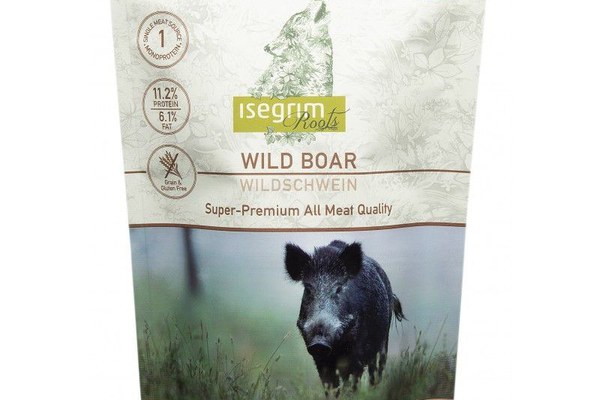 Pouch Isegrim Dog Adult - Wild Boar Monoprotein 410 g, cu pastarnac, ulei de seminte de in si ierburi de padure, este o hrana completa pentru caini adulti.