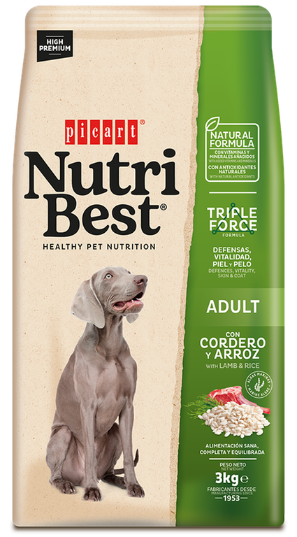 Hrana Uscata Caini Premium, NutriBest Adult Dog, Miel si Orez, 3 kg este o hrană completă cu miel și orez pentru câini adulți (>12 luni).\nNutriBest Adult cu Miel și Orez este o hrană High Premium, creată de către experții noștri în nutriție și medici veterinari, pentru a susține creșterea sănătoasă și vitalitatea câinelui tău, în timp ce se bucură de o sănătate ideală. Conține alge marine pentru pentru a îngriji și a menține sănătatea pielii și a blănii câinelui tău.\nEste de asemenea o soluție alternativă la rețetele pe bază de pui. Ajută la gestionarea sensibilității alimentare la proteina de pasăre. \nMai multe proteine animale. Are un aport suplimentar de carne și somon. Proteinele animale sporesc palatabilitatea hranei. \nCarnea este ingredientul principal (25%). Proteinele din carne asigură câinelui toți amino-acizii necesari pentru dezvoltarea și întreținerea celulelor organismului.\nIngrediente nturale. Noua rețetă este formulată cu ingrediente naturale*, fără conservați și cu antioxidanți naturali. \nIngrediente pe bază de plante. Formula îmbunătățită conține roșcove și pulpă de sfeclă, care sunt surse de fibre foarte digestibile și proteine vegetale. \nNu conține soia sau organisme modificate genetic. \nBeneficii \nPIELE ȘI BLANĂ SĂNĂTOASE\nRețeta conține acizi grași Omega 3 din ulei de somon pentru a ajuta la susținerea sănătății pielii și a blănii câinelui.\nSISTEM IMUNITAR PUTERNIC\nCu adaos de Vitamina A și E, alături de Cupru și Seleniu pentru a ajuta la menținerea sănătății sistemului imunitar.\nVITALITATE\nGama Nutribest a fost formulată cu grijă pentru a susține câinele activ și sănătos.