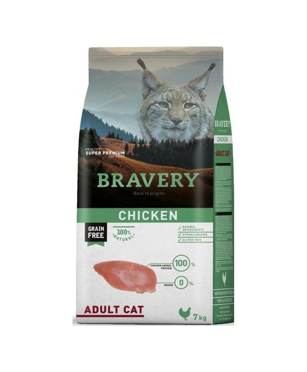 Hrană completă pentru pisici adulte.\nLa BRAVERY folosim întotdeauna ingrediente naturale și de înaltă calitate pentru a crea hrana noastră super premium dedicată pisicilor. Fiecare ingredient este analizat cu grijă în cadrul laboratoarelor noastre, înainte de a fi utilizat. Sănătatea animalelor de companie este singura noastră prioritate.\nBeneficii: Carnea de pui este un ingredient bogat în proteine, cu un conținut scăzut de grăsimi și ușor de digerat. Grăsimea de pui contribuie la menținerea sănătății pielii.