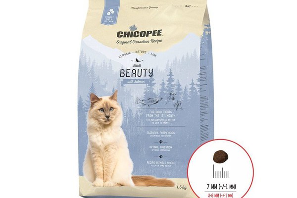 Pentru pisicile adulte din luna a 12-a de viață\nRețetă fără grâu (30% proteine / 15% grăsimi)\nAcizi grași esențiali Omega 3 și Omega 6\nDigestie optrimă\n\nChicopee CNL BEAUTY cu somon este o hrană completă pentru pisici adulte, ajută la îmbunătățirea digestiei, sănătății și longevității animalului. Această hrană nu conține grâu sau gluten și aparține clasei super-premium.\n\nSomonul este o sursă de proteine animale foarte digerabile și acizi grași Omega-3, inclusiv DHA (acid docosahexaenoic) și EPA (acid eicosapentaenoic). Aceste proteine sunt necesare pentru sănătatea pielii și a blănii animalelor de companie, pentru metabolismul normal și pentru dezvoltarea activității creierului.\nCarne de pasăre: carnea de pasăre este cea mai digerabilă și alimentară proteină. Mâncarea conține doar carne de pasăre (pui, fazan, rață) crescută în fermele proprii.\nFără conservanți: doar antioxidanții naturali sunt folosiți în alimente pentru depozitare.\nUlei de somon: uleiul de somon de înaltă calitate este bogat în acizi grași esențiali Omega-3, inclusiv DHA (acid docosahexaenoic) și EPA (acid eicosapentaenoic), care au un efect benefic asupra tuturor organelor și sistemelor corpului. Uleiul de somon este cel care face blana mătăsoasă.\nCicoare: O sursă de inulină care oferă efecte antitoxice și protectoare.