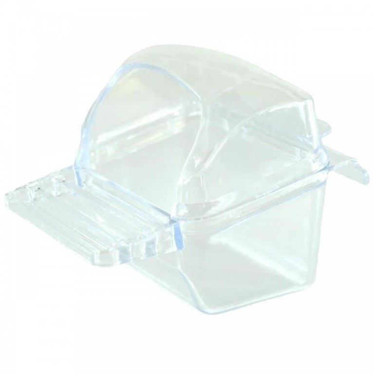 Hranitor Pasari Exotice 8x5x6 cm.\n- Hranitor pasari exotice, este confectionat din plastic transparent, foarte rezistent.- Fixare cu usurinta de gratiile coliviei cu ajutorul agatatorilor.- Usor de curatat.\nDimensiuni: 7 x 4 x 4 cm.
