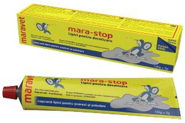 Instrucțiuni de utilizare:\nMara-Stop lipici pentru deratizare este destinat pentru combaterea șobolanilor (Rattus spp.) și șoarecilor (Mus spp.) în depozitele cu recolte din agricultură și în gospodării.\nA se aplica produsul pe o suprafață corespunzătoare (o bucata de lemn, hârtie, carton) iar în mijlocul acestei suprafețe se va pune o bucată de brânză sau nucă.\nCompoziție Poliisobutilen 100%.\nConținut 135 g.\nA se păstra departe de alimente, băutură și hrana pentru animale.În ambalajul original perioada de valabilitate a produsului este nelimitată.