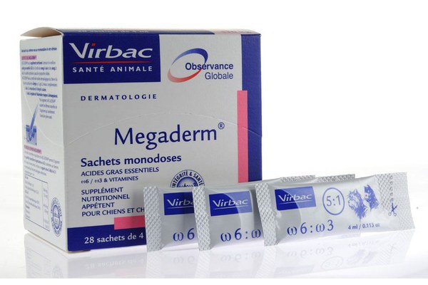 MegaDerm 4 ml, 28 plicuri - Supliment alimentar cu acizi grasi esentiali, ce ajuta la refacerea integritatii cutanate si la imbunatatirea calitatii blanii la caini si pisici.\nCompozitie: Megaderm® beneficiaza de o formula pura si echilibrata de acizi grasi esentiali, care include 4 acizi grasi esentiali din surse de calitate ridicata:\n\nacizi grasi Omega 3 ( acid linoleic si acid gama-linoleic)\nacizi grasi Omega 6 (acid eicosapentaenoic si acid docosahexaenoic).\nMegaderm® contine ulei de Luminita Noptii, ulei de Floarea soarelui si ulei de peste de apa rece.\nMegaderm® mai contine si Vitaminele A si E, ce intensifica efectele acizilor grasi esentiali.\nAntioxidantii din Megaderm® garanteaza o conservare optima a acizilor grasi esentiali, de la fabricare si pina la metabolizarea lor.\nMegaderm® are un raport exceptional de Omega 6 : Omega 3 de 5:1, ceea ce asigura o influenta asupra lantului inflamator pentru a stimula productia de mediatori anti-inflamatori.\n\nIndicatii\n\nMegaderm® se recomanda animalelor cu afectiuni dermatologice sau animalelor cu piele normala sau cu istoric de afectiuni dermatologice pentru intretinerea blanii.\nÎn dermatita atopica canina, Megaderm® poate fi folosit si pentru micsorarea dozei de corticosteroizi necesare.\nMegaderm® se recomanda la ciini si pisici cu alergii cutanate si tulburari de cheratinizare, in combinatie cu alte produse dermatologice: Allermyl®, sebolytic®, Pyoderm®, Allerderm®, Cortavance®, Effipro® sau Duowin®.\n\nActiune: Acizii grasi esentiali au un rol structural la nivelul epidermei si ajuta la refacerea compozitiei si functiei barierei epidermale lipidice:\n\nimbunatatesc calitatea si stralucirea blanii\nreduc factorul de pierdere transepidermala a apei\n\nPrezentare si posologie:\n\nFiecare cutie de Megaderm ® contine cite 28 de plicuri confectionate din aluminiu, ce asigura o utilizare usoara si o administrare precisa, fara pierderi si o conservare excelenta a produsului.\nMegaderm® este disponibil in doua variante, 4 ml pentru ciini si pisici de pina la 10 kg si 8 ml pentru ciini intre 10 si 30 kg.\nCutia Megaderm® include un calendar de administrare, pentru a le arata proprietarilor cum sa foloseasca plicurile.