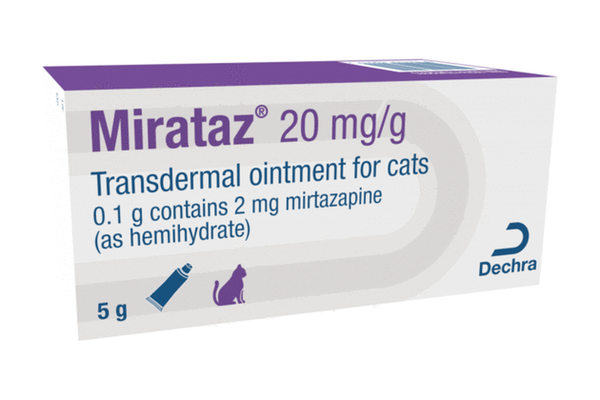 Gestionați pierderea în greutate neintenționată la pisici cu Mirataz® (mirtazapină unguent transdermic).\nÎntr-un studiu clinic, Mirataz a dus la creșterea semnificativă în greutate la pisici în doar 14 zile după aplicarea topică a 2 mg pe zi.\nMirataz vă oferă o modalitate practică de a gestiona pierderea în greutate a pacientului fără administrarea de medicamente orale și nu se bazează pe pisica să mănânce pentru a fi medicamentată.\nFormulat utilizând tehnologia exclusivă Accusorb, Mirataz atinge concentrații plasmatice măsurabile de mirtazapină la pisici.\nInformații importante:\nMirataz® (unguent transdermic mirtazapină) este destinat utilizării topice la pisici numai sub supraveghere veterinară. A nu se utiliza la pisici cu hipersensibilitate cunoscută la mirtazapină sau la oricare dintre excipienți. A nu se utiliza la pisicile tratate cu inhibitori de monoaminooxidază (IMAO). Nu este destinat pentru uz uman. A nu se lăsa la îndemâna copiilor. Purtați mănuși atunci când manipulați / aplicați, spălați-vă pe mâini și evitați contactul dintre pisica tratată și oameni sau alte animale timp de 2 ore după aplicare. A se utiliza cu precauție la pisicile cu afecțiuni hepatice și renale. Consumul de alimente pentru pisici trebuie monitorizat la întreruperea tratamentului. Siguranța nu a fost evaluată la pisicile mai mici de 2 kg, cu vârsta mai mică de șase luni sau la pisicile însărcinate, însărcinate sau care alăptează. Cele mai frecvente reacții adverse observate în timpul studiilor clinice au fost reacțiile la locul de aplicare, anomalii comportamentale (vocalizare și hiperactivitate) și vărsături.