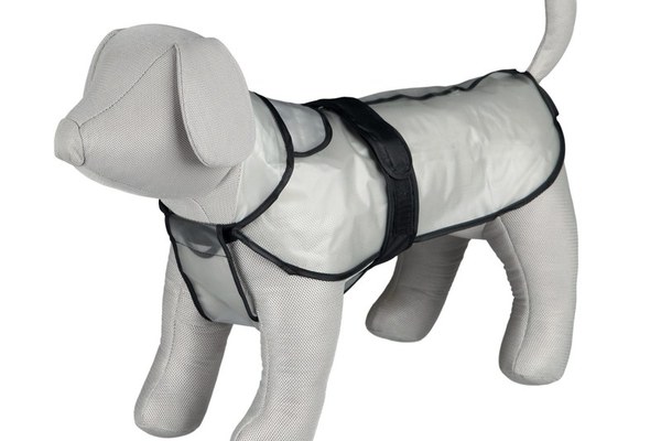 Lungimea 50 cm (de la gat pana la coada). Circumferinta bustului 48-74 cm.\n\nPelerina transparenta cu margine neagra, pentru ploaie\nFabricata din PVC\nDetalii reflectorizante\nAjustabila\n\nSTABILIREA MARIMII POTRIVITE CAINELUI DUMNEAVOASTRA:\nMasura hainelor pentru caini este determinata de dimensiunea animalului masurata de la gat pana la baza cozii.\nEste recomandat sa se masoare si circumferinta pieptului (in spatele picioarelor din fata) si a gatului (locul unde zgarda sta in mod normal), deoarece constructia cainelui dumneavoastra poate afecta dimensiunea hainei.