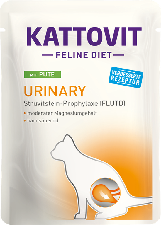Hrana umeda pentru pisici Kattovit Feline Diet Urinary cu Curcan 85 gr este un furaj complet dietetic pentru pisici adulte.\nBeneficii:\nRecomandat pentru reducerea recurentei calculilor de struviti si pentru boala tractului urinar inferior.\nConține DL-metionină și sulfat de calciu ca substanțe acidifiante urinare și are un conținut scăzut de magneziu.
