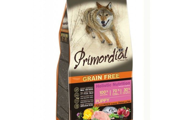 Primordial Grain-Free Holistic Dog Puppy Chicken & Sea Fish este o hrana completa pentru puii de caine de orice talie, fara cereale, bogata in proteine si usor digerabila.\nAnaliză garantată:\n\nUmiditate: 8%,\nProteină brută: 30%,\nGrăsimi și uleiuri brute: 19%,\nCenușă brută: 8%,\nFibră brută: 2.6%,\nEnergie metabolizabilă: 3950 Kcal/kg\n\nProdusul trebuie administrat uscat. Cainele trebuie sa aiba intotdeauna apa proaspata disponibila. Depozitati intr-un loc uscat si racoros.