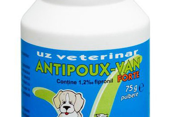 Produsul ANTIPOUX-VAN FORTE are acţiune antiparazitară împotriva speciilor de purici (Ctenocephalides spp.) şi cǎpuşe (Ixodes spp., Rhipicephalus spp., Dermacentor spp.) care parazitează câinii şi pisicile.\n\nCâinii şi pisicile se pudrează uşor în special în regiunea gâtului.\nPentru a se obţine efectul antiparazitar urmărit pudra trebuie să ajungă în contact cu epiderma animalului. De asemenea, se pudrează cuştile şi locurile de odihnă.\nO aplicare corectă asigură protecţie animalului timp de 60 zile la câini și 30 zile la pisici.