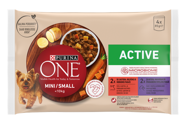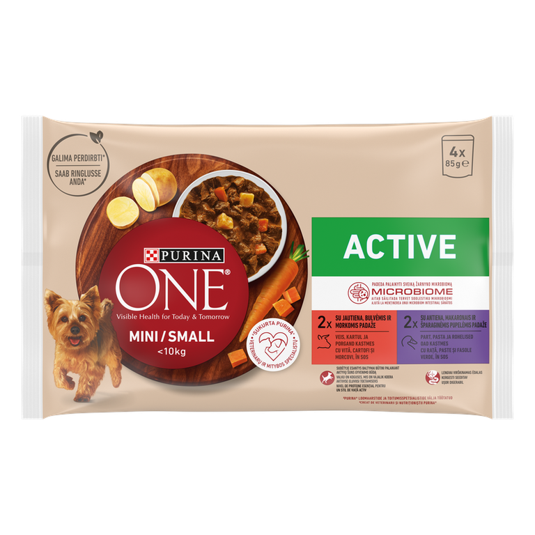 PURINA ONE MINI Active, vita, cartofi, si morcovi/ cu rata, paste si fasole verde, in sos, 4x85 g