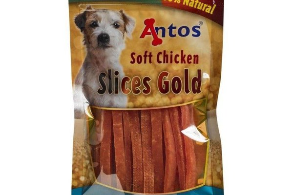 Recompense moi pentru câini, sub formă de fâșii, cu pui.\nRăsplătește-ți câinele cu gustări savuroase cu pui. Recompensele Antos Gold sunt irezistibile, deoarece îi satisfac apetitul și îți hrănesc câinele cu fiecare mușcătură. Conțin zero cereale sau ingrediente artificiale, de aceea sunt gustările perfecte, cu cele mai bune ingrediente naturale.\nBeneficii: Aceste delicatese sunt făcute cu pui adevărat pentru aroma savuroasă și intensă pe care câinii o doresc. Aceste gustări premium delicioase sunt 100% naturale, perfecte drept gustare între mese sau un simplu moment de răsfăț. Nu conțin zahăr, cereale sau gluten și sunt bogate în proteine. Având o densitate mică, sunt potrivite pentru a fi consumate zilnic de către câinii care nu pot mesteca hrana cu putere, precum cei seniori.