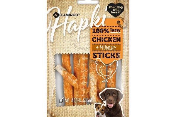 Piele masticabilă și carne de pui\nMenține sănătatea și forma fizică a câinelui\nÎmbunătățește tonusul psihic\nFără zahăr adăugat\n\nFiecare pachet conține 5 bețișoare, fiecare cu lungimea de 12 cm și cântărind 80 g.COMPOZIȚIE: piele de pui 52.9%, carne de pui 36.11%, orez 1.98%, glicerină, proteine vegetale, amidon.CONSTITUENȚI ANALITICI: proteină brută 65%, grăsimi brute 3.5%, cenușă brută 3.5%, fibră brută 1.0%, umiditate 18%.\nINSTRUCȚIUNI DE UTILIZARE:\nRecompensele de la FLAMINGO reprezintă o hrană complementară, de cea mai bună calitate, naturală, pentru câinii de orice talie. Indicate pentru îmbunătățirea tonusului psihic al câinelui dumneavoastră.\nSe administrează: câini cu greutatea corporală între 3 și 5 kg - 1 baton/zi; câini cu greutatea corporală între 5 și 10 kg - 2 batoane/zi; câini cu greutatea corporală între 10 și 20 kg - 3 batoane/zi; câini cu greutatea corporală peste 20 kg - 5 batoane/zi contribuind astfel la menținerea sănătății și forma acestuia.\nProdusul nu este destinat pentru consumul uman! Apa prospătă trebuie să fie la dispoziție în permanență!