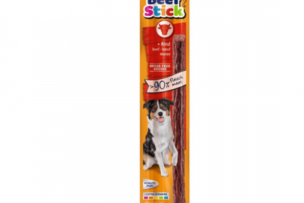Recompensa pentru caini Vitakraft Beef Stick cu Vita 12g - Este gustarea perfecta dintre mese. Contine mai mult de 90% carne. \nCOMPOZITIE: carne si derivate de origine animala 93,9% (din care carne macra 91% si vita 54,5%), minerale, derivate de origine vegetala, cereale. CONSTITUENTI ANALITICI: umiditate 33%, proteine 30%, continut in grasimi 25%, fibre brute 3%, cenusa bruta 9%. ADITIVI/kg: vitamina A (3a672a) 5.000 U.I.; vitamina D3 (E671) 500 U.I. Fara coloranti artificiali sau conservanti, fara amelioratori artificiali de aroma. INDICATII DE HRANIRE: Greutatea corporala a cainelui (kg) = bucati/zi: 2 - 5kg = 1/2 bucata, 5 - 15kg = 1/2 - 1 bucata, 15 - 25 kg = 1-2 bucati, 25 - 35kg = 2-3 bucati.