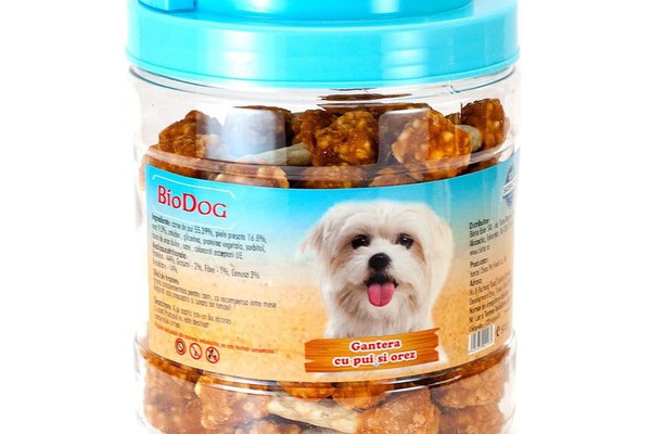 BIODOG GANTERA CU PUI SI OREZ 500 GR\nIngrediente:Carne de pui 55,39%, piele presata 16,8%, orez 9,3%, glicerina, proteina vegetala, sorbitol, amidon, faina de orez, sare, coloranti acceptati UE.\nAnaliza nutritionala:Proteina 44%, Grasimi 2%, Fibre 1%, Cenusa 3%, Umiditate 14%. \nGhid de hranire:Hrana complementara pentru caini, recompense intre mese.Asigurati apa proaspata si curata tot timpul la dispozitia cainelui.\nDepozitare:A se pastra in loc racoros si uscat.Produsul nu este destinat consumului uman.