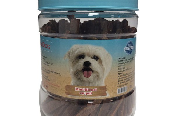 RECOMPENSE PENTRU CÂINI BIODOG SNACK MINI-FILEURI CU PUI 500GR\nCOMPOZIȚIE: carne de pui 79.6%, proteină vegetală, glicerină, amidon vegetal, sare.\nCONSTITUENȚI ANALITICI: proteine 48.0%, grăsimi 4.0%, fibre 1.0%, cenușă 5.0%, umiditate 16.0%. \nGHID DE HRĂNIRE: Hrană complementară pentru câini, ca recompensă între mese. Asigurați apă proaspătă și curată tot timpul!\nDEPOZITARE: A se păstra într-un loc răcoros și uscat! Produsul nu este destinat consumului uman.