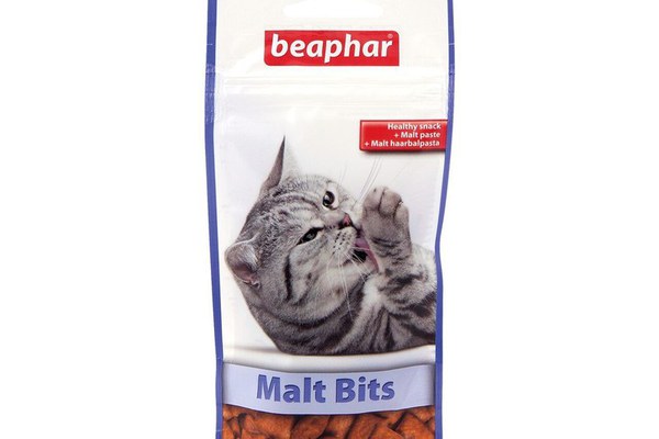 Beaphar Malt Bits Cat este o gustare sănătoasă și crocantă pentru pisicuțe.\nBucățile sunt umplute cu pastă de malț pentru a promova eliminarea naturală a părului ingerat.\nO gustare sănătoasă pentru pisici, care poate fi oferită ca tratament zilnic sau ca adaos la dieta zilnică pentru a ajuta la o modalitate naturală de a scăpa de părul din intestine. COMPOZIȚIE: cereale, lapte și derivate din lapte, uleiuri și grăsimi, derivate de origine vegetală, minerale, drojdii, pește și derivate din pește, carne și derivate de origine animală. CONSTITUIENȚI ANALITICI: proteină brută 30%, grăsimi brute 8.8%, fibră brută 1.6%, cenușă brută 2.5%, umiditate 8.7%, calciu 0.15%, fosfor 0.5%, sodiu 0.15%, magneziu 0.021%, potasiu 0.12%, acid a-linolenic 0,075%. ADITIVI NUTRIȚIONALI: vitamina A 4600 UI, vitamina B1 4.1 mg. Sfaturi de hrănire: \n\n Se pot oferi 5 până la 10 bucățele pe zi.\n Oferiți apă proaspătă la discreție.\n A se depozita la loc uscat și răcoros.