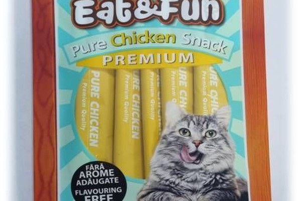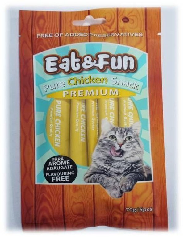Recompense pisici, Eat & Fun Pure Chicken Snack, 70 g - recompense lichide pentru pisica \n\nGustare sanatoasa – fara arome adaugate \nGust irezistibil – continut ridicat de pui/ somon/ krill \nAjuta acuitatea vizuala si buna functionare a inimii – contine taurina \nDezvolta sistemul imunitar – contine vitamine, fructooligozaharide (FOS) \nUsor de administrat – pachetul contine 5 portii invididuale \n\nINGREDIENTE: Compoziția materiei prime: Pui 75%, Apă, Amidon de cartofi, Ulei de semințe de floarea soarelui, Pudră hidrolizată de pui. Aditivi / Kg: Fructooligozaharide (FOS) 2000 mg/kg, Taurina 2000 mg/kg, Vitamina A 500 UI/kg, Vitamina D3 50 UI/kg, Vitamina E 30 UI/kg. ANALIZA: protein bruta ≥10%, Grasime bruta ≥1.5%, Fibre brute ≤2%, Cenusa Bruta ≤3%, Umiditate 83.00%.\nRECOMANDĂRI DE HRĂNIRE: Se recomandă ca pisoii cu greutatea de 1-2 kg să mănânce 2-4 plicuri (x 14 g) pe zi, iar pisicile adulte care cântăresc 3-4 kg să mănânce 6-8 plicuri (x 14 g) pe zi. Cantitățile menționate sunt ca recomandare și pot fi ajustate în funcție de vârsta, rasa, greutatea, nivel de activitate și condiția fizică a pisicii.