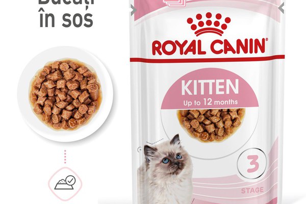 Caracteristici & Beneficii:\n\nTextură moale potrivită dentiției de lapte\nSistem imunitar puternic\nDezvoltare cerebrală\nSusține microbiomul\n\nFormula ROYAL CANIN® Kitten hrană umedă sub formă de bucățele în sos, este special concepută pentru a susține cerințele nutriționale ale pisoilor aflați în „etapa de consolidare” a creșterii lor. Această rețetă este dedicată pisoilor cu vârsta cuprinsă între 4 și 12 luni, cărora le oferă suportul nutrițional adecvat perioadei pe care ei o parcurg, marcată de schimbări fizice și comportamentale semnificative.\nAceastă hrană este perfect adaptată pisoilor aflați în etapa de creștere, datorită bucățelelor moi în sos, ce au o dimensiune, textură și aromă optime.\nConține de asemenea nutrienți precum vitamina C și E pentru a susține dezvoltarea sistemului imunitar sănătos al pisoiului. S-a demonstrat că prezența acestor antioxidanți în hrană stimulează nivelul și rapiditatea răspunsului imunitar după vaccinare.\nRețeta ROYAL CANIN® Kitten hrană umedă sub formă de bucățele în sos, este de asemenea îmbogățită cu acizi grași omega-3 (DHA) pentru a ajuta la dezvoltarea cerebrală și sănătatea simțului vederii.\nDatorită asocierii de prebiotice (MOS) și proteine cu grad ridicat de digestibilitate ROYAL CANIN® Kitten hrană umedă sub formă de bucățele în sos, contribuie la susținerea echilibrului sănătos al microbiomului intestinal (flora intestinală), favorizând o bună digestie.\nFormula ROYAL CANIN® Kitten hrană umedă sub formă de bucățele în sos a fost creată pentru pentru a satisface chiar și cel mai exigent apetit. Această hrană umedă îi oferă pisoiului dumneavoastră o experiență senzorială pozitivă, susține un nivel sănătos de hidratare și este perfectă pentru hrănirea mixtă alături de crochetele ROYAL CANIN® Kitten.\n După la vârsta de 12 luni, pisoiul dumneavoastră va avea nevoie de o hrană special adaptată pentru a-i îndeplini cerințele nutriționale în calitate de pisică adultă. În această etapă, puteți face trecerea către gama de produse ROYAL CANIN® dedicată pisicilor adulte, disponibilă atât sub formă de hrană uscată, cât și umedă, ca pate, bucățele în sos sau aspic.
