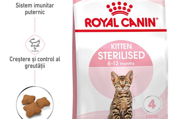 Caracteristici & Beneficii:\n\nCreșterea și controlul greutății \nSistem imunitar puternic\nDezvoltare cerebrală\nSusține microbiomul\n\nFormula ROYAL CANIN® Sterilised Kitten este special concepută pentru a susține cerințele nutriționale ale pisoilor sterilizați aflați în „etapa de consolidare” a creșterii lor. Această rețetă este dedicată pisoilor sterilizați cu vârsta cuprinsă între 6 și 12 luni, cărora le oferă suportul nutrițional adecvat perioadei pe care ei o parcurg, marcată de schimbări fizice și comportamentale semnificative.\nAceastă hrană adaptată are un aport moderat de grăsimi pentru a ajuta la reducerea riscului de a lua în excesiv în greutate, conținând în același timp niveluri optime de proteine, calciu și fosfor pentru o dezvoltare sănătoasă.\nConține de asemenea nutrienți precum vitamina C și E pentru a susține dezvoltarea sistemului imunitar sănătos al pisoiului. S-a demonstrat că prezența acestor antioxidanți în hrană stimulează nivelul și rapiditatea răspunsului imunitar după vaccinare.\nROYAL CANIN® Sterilised Kitten este de asemenea îmbogățită cu acizi grași omega-3 (DHA) pentru a sprijini dezvoltarea cerebrală și sănătatea vederii pisoilor.\nDatorită asocierii de prebiotice (MOS) și proteine cu grad ridicat de digestibilitate ROYAL CANIN® Sterilised Kitten contribuie la susținerea echilibrului sănătos al microbiomului intestinal (flora intestinală), favorizând o bună digestie.\nCrocheta ROYAL CANIN® Sterilised Kitten a fost special concepută pentru maxilarele de mici dimensiuni ale pisoiului dumneavoastră. Pe măsură ce pisoiul mestecă hrana, crocheta are un efect de periaj mecanic, ajutând astfel la menținerea sănătății dentare.\nDupă la vârsta de 12 luni, pisoiul dumneavoastră sterilizat va avea nevoie de o hrană special adaptată pentru a-i îndeplini cerințele nutriționale în calitate de pisică adultă. În această etapă, puteți face trecerea către formula ROYAL CANIN® Appetite Control Care, disponibilă atât sub formă de hrană uscată, cât și umedă, cu bucățele în sos.