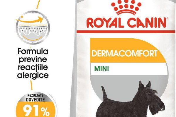 Caracteristică esențială:\n\nFormula previne reacțiile alergice\n\nPielea iritată nu este o plăcere pentru nimeni, iar câinele dumneavoastră nu face excepție. Știați că iritațiile pielii constituie cel mai frecvent motiv pentru care câinii sunt aduși la medicul veterinar?\nO piele sensibilă, cu senzații de mâncărime, duce la scărpinat excesiv și ca urmare câinele dumneavoastră poate să își traumatizeze pielea cu ghearele, fiind așadar expus riscului de infecții.\nFormula cu potențial alergenic redus ROYAL CANIN® Dermacomfort Mini are la bază o gamă de proteine atent selecționate. Aceast suport nutrițional special adaptat contribuie la menținerea în condiții optime a sănătății pielii câinelui dumneavoastră susținând în același timp o blană deasă și sănătoasă.\nRecomandate câinilor cu greutatea de maxim 10 kg, crochetele ROYAL CANIN® Dermacomfort Mini sunt concepute special pentru maxilarul mic al câinelui dumneavoastră.\nAceastă rețetă delicioasă susține bunăstarea generală a câinelui dumneavoastră. Conține acizii grași Omega 3 și 6, inclusiv GLA, EPA și DHA, care sprijină și hrănesc pielea, făcând-o mai puțin sensibilă la factorii iritanți din mediul înconjurător al câinelui dumneavoastră.\nGama noastră nutrițională Dermacomfort este disponibilă sub două forme: crochete crocante și pate delicios la plic. Fiecare formulă oferă aport nutrițional complet dar pentru beneficii optime se recomandă mixarea lor, acestea fiind perfect complementare. De ce să nu încercați pateul ca topping delicios la crochete?\nNu este nevoie să ne credeți pe cuvânt, 91% din proprietarii de câini și-au exprimat satisfacția după doar 2 luni de utilizare continuă a acestui produs. Aceasta înseamnă că rezultatele ROYAL CANIN® Dermacomfort și-au dovedit succesul.