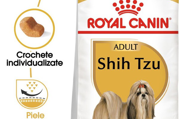 Caracteristici/ beneficii principale:\n\nSănătatea pielii\nSănătatea dentară\nReducerea volumului și mirosului scaunului\n\nRecomandată începând cu vârsta de 10 luni, hrana ROYAL CANIN® Shih Tzu Adult este special concepută pentru a îndeplini toate cerințele nutriționale ale câinelui dumneavoastră Shih Tzu adult.\nHrana ROYAL CANIN® Shih Tzu Adult conține un mix optim de nutrienți care ajută la menținerea sănătății pielii câinelui dumneavoastră, ceea ce implicit are un efect pozitiv asupra sănătății blănii. Această formulă include acizii grași Omega-3 EPA and DHA, fiind totodată îmbogățită cu ulei de Borago; acești acizi grași joacă un rol important în hrănirea pielii și blănii câinelui dumneavoastră.\nSoluția adaptată pe care o oferă ROYAL CANIN® Shih Tzu Adult include de asemenea chelatori de calciu, care contribuie la menținerea igienei dentare a câinelui dumneavoastră.\nHrana ROYAL CANIN® Shih Tzu Adult ajută la susținerea funcției digestive, contribuind la reducerea volumului scaunului; mai mult, ajută și la reducerea mirosului!\nCrocheta ROYAL CANIN® Shih Tzu Adult este adaptată în mod specific pentru a corespunde caracteristicilor acestei rase. Forma și dimensiunile acesteia sunt concepute special pentru a fi mai ușor de apucat și de mestecat de către câinele dumneavoastră.