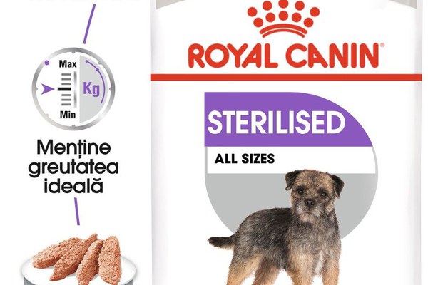 Caracteristici esențiale:\n\nMenține greutatea ideală\nGama nutrițională special dedicată câinilor sterilizați\n\nAdesea, metabolismul câinelui încetinește după sterilizare și ați putea observa că preferă mai degrabă să stea tolănit pe canapea decât să se aventureze în diverse activități și, cu toate acestea, să aibă o poftă de mâncare insațiabilă.\nEste un fapt bine cunoscut că nutriția echilibrată poate ajuta animalele să facă față mai bine problemelor de sănătate. Mai multe decenii de cercetare științifică avansată în domeniul nutriției canine vă stau la dispoziție în această hrană destinată câinilor sterilizați.\nRecomandată câinilor de orice talie, formula ROYAL CANIN® Sterilised Pate are un aport special de nutrienți activi care satisfac apetitul câinelui, menținându-l în același timp activ și în formă.\nRețeta delicioasă ROYAL CANIN® Sterilised Pate este bogată în proteine foarte ușor digestibile, fiind special adaptată cerințelor specifice ale câinelui dumneavoastră. Proteinele din această hrană ajută câinele să își mențină masa musculară, reducând totodată aportul caloric și de grăsimi.\nMai mult, ROYAL CANIN® Sterilised Pate are un conținut moderat de grăsimi și un complex optim de fibre alimentare pentru a ajuta câinele să își mențină greutatea ideală, inducându-i totodată o senzație de sațietate.\nÎn afară de acest pate delicios, gama nutrițională Sterilised este disponibilă și în varianta uscată sub formă de crochete crocante. Fiecare formulă oferă aport nutrițional complet dar pentru beneficii optime se recomandă mixarea lor, acestea fiind perfect complementare. De ce să nu încercați pateul ca topping delicios la crochete?\nOptați pentru ROYAL CANIN® Sterilised Pate și veți observa beneficiile pe care le oferă câinelui dumneavoastră acești nutrienți de calitate superioară, ajustați pentru a vă menține câinele activ și sănătos.