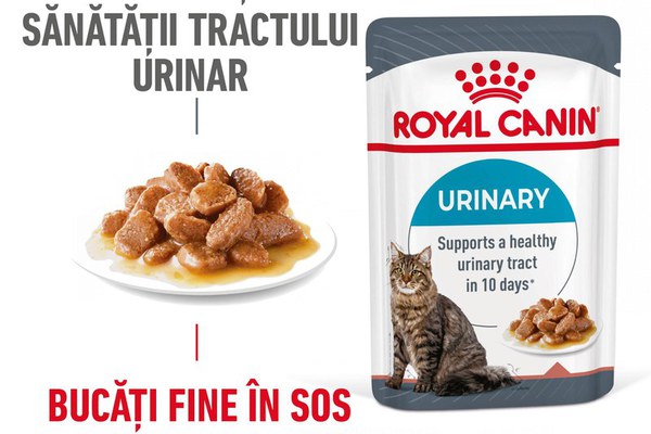 Caracteristici & Beneficii:\n\nAjută la menținerea sănătății tractului urinar\nRezultate dovedite\n\nROYAL CANIN® Urinary Care în Sos este o formulă nutrițională completă și echilibrată, special concepută pentru a ajuta la susținerea unui mediu urinar sănătos, pentru un tract urinar optim.\nROYAL CANIN® Urinary Care are rezultate dovedite. Studiul nostru intern* a arătat că această formulă a contribuit la sănătatea tractului urinar în cazul pisicilor participante, în doar 10 zile de hrănire cu programul nutrițional Urinary Care (care asociază hrana uscată cu formulele de hrană umedă).\nHrana ROYAL CANIN® Urinary Care este disponibilă și sub formă de hrană umedă în aspic sau de hrană uscată. Asocierea hranei umede și a celei uscate le oferă pisicilor diversitatea pe care o iubesc.\n*Studiu intern Royal Canin