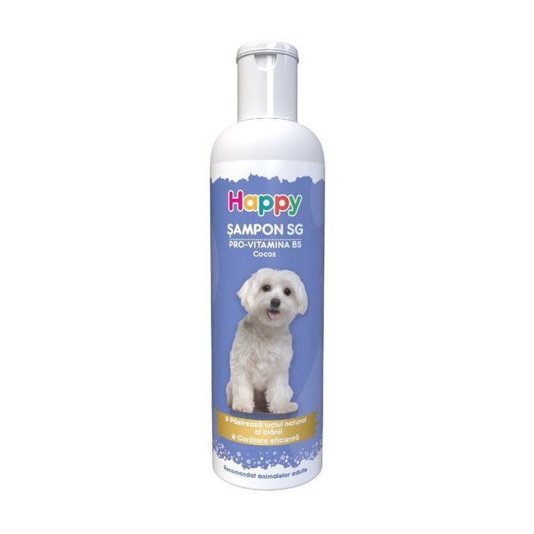 Beneficii produs:\nCuratare eficienta; Pastreaza luciul natural al blanii;Actiune:\nPro vitamina B5 ofera un efect calmant, reparator, hidratant și antiinflamator al pielii.Dietanolamidă de cocos ce face ca spuma să fie mai bogată iar curatarea, mai eficienta.\nHappy SG Cocos cu Pro-Vitamina B5 si esenta de cocos, se utilizeaza la spalarea de rutina a animalelor de companie pentru intretinerea curateniei, redarea luciului natural al blanei si confera un miros placut.